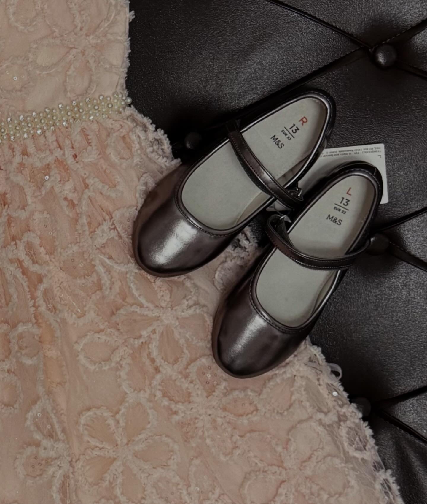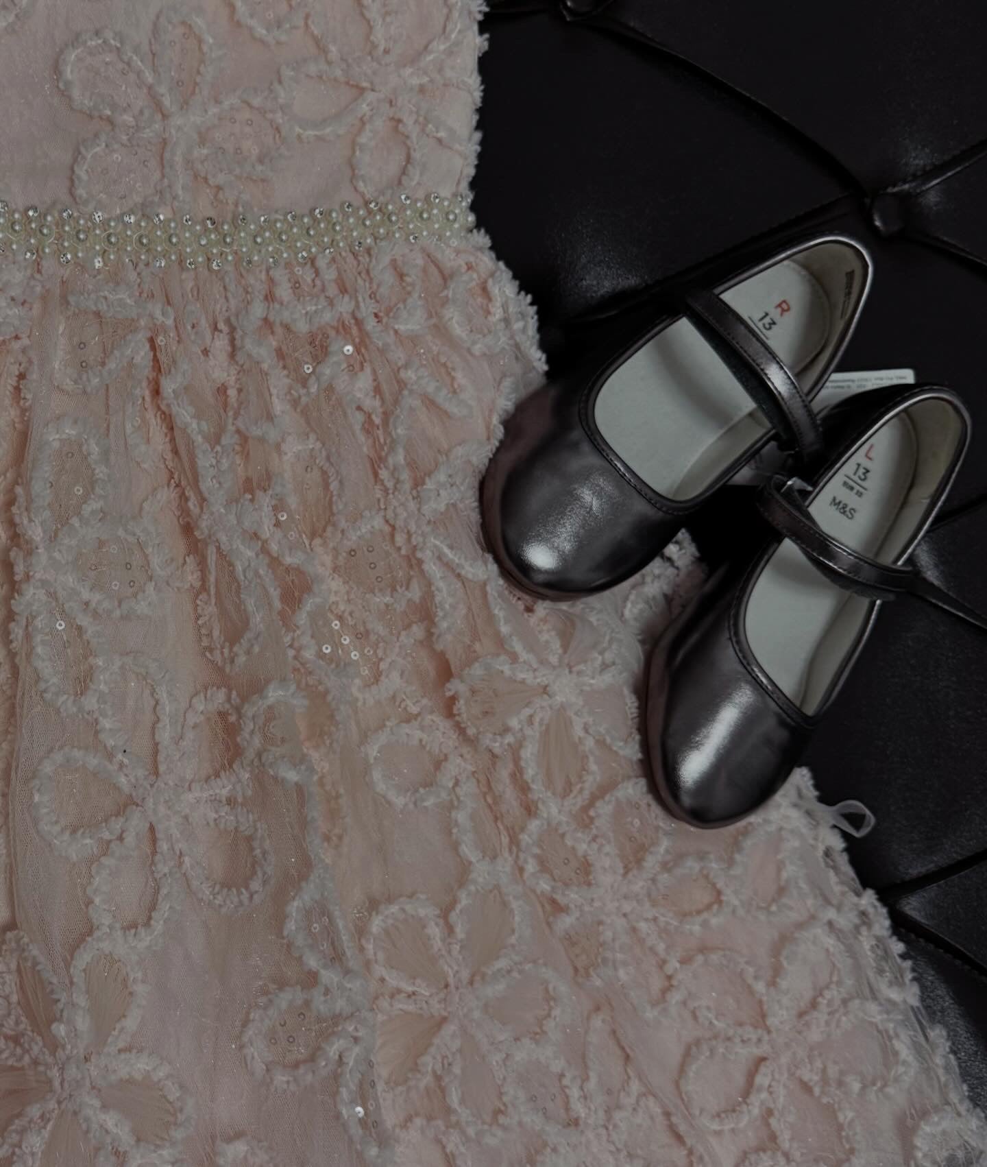 Elevate any special occasion with the American Princess Elegant Blush Floral Lace Event Dress Set. The pearl-embellished waistband adds a touch of luxury and sparkle, while the full, gently flared silhouette creates a picture-perfect look. Complete the ensemble with the included M&S metallic silver Mary Jane shoes for a timeless and beautiful event-ready outfit.