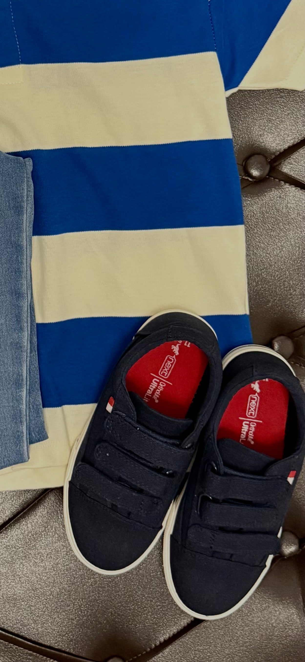 Blue & Cream Rugby Tee + Light-Wash Jogger Jeans + Next Navy Sneakers