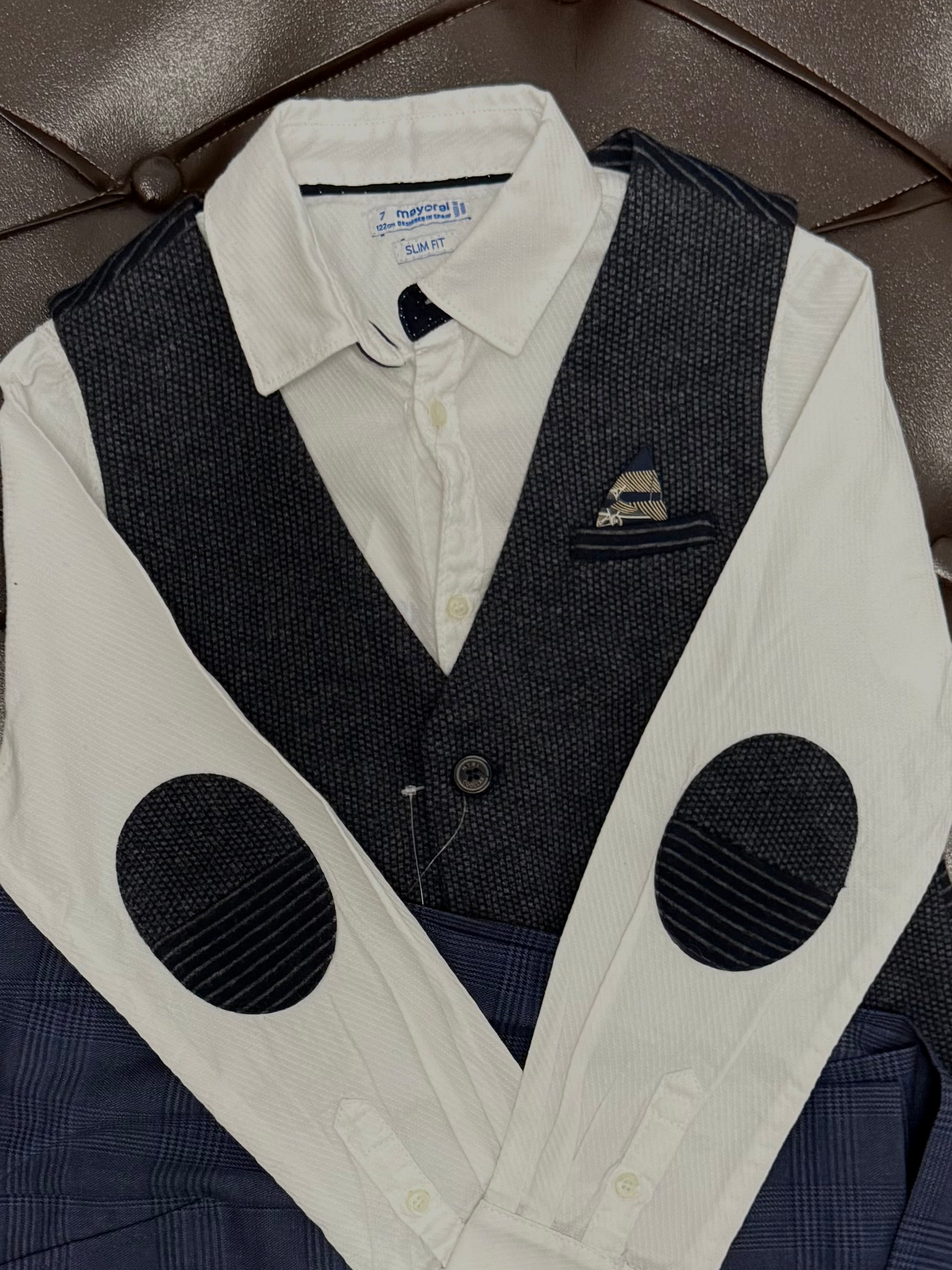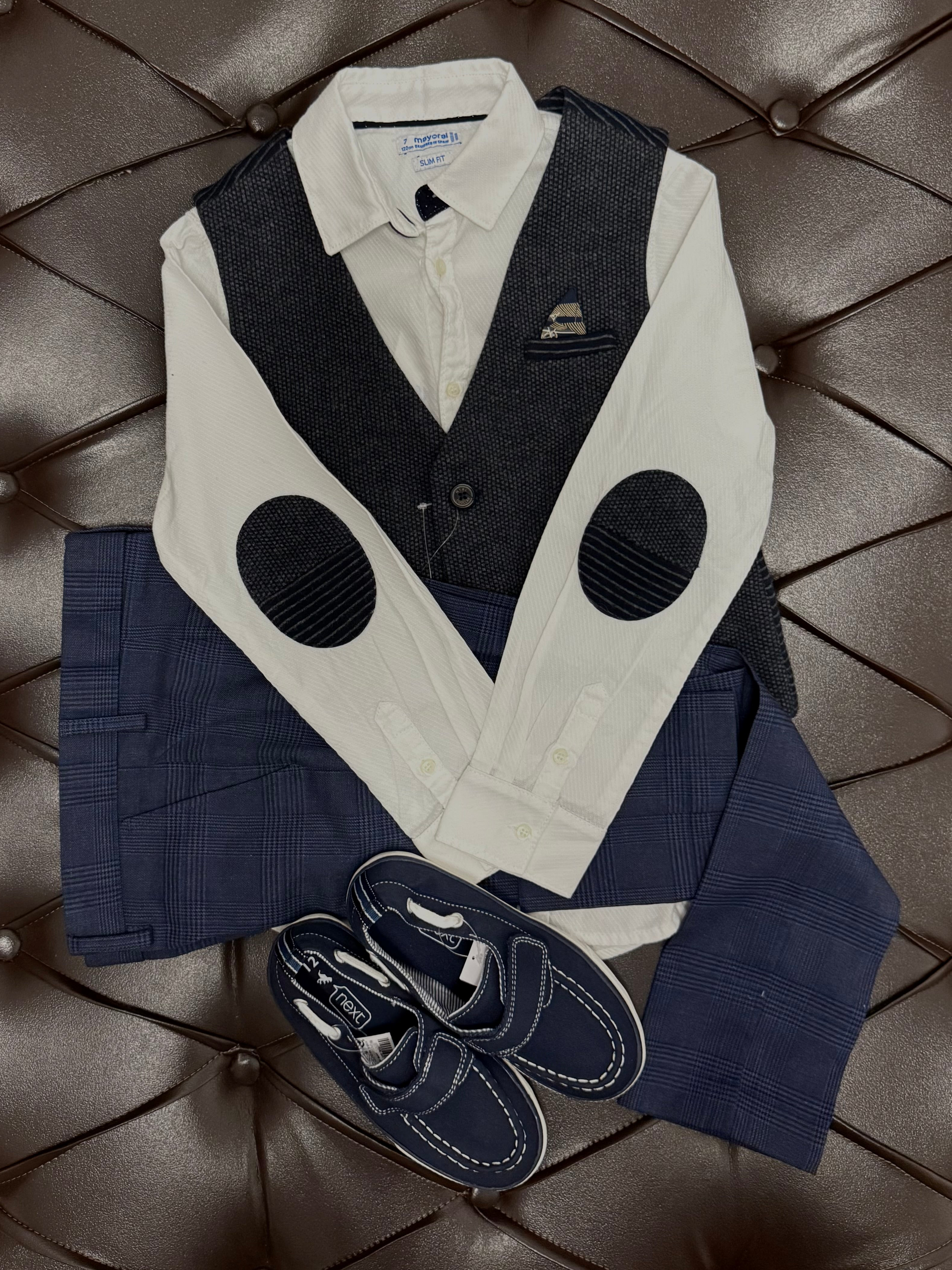 A sophisticated boys’ formal outfit featuring a crisp white long-sleeve shirt with elbow patches, paired with a textured navy waistcoat and matching tailored trousers. Completed with smart navy loafers for a polished, gentleman-ready look. Ideal for weddings, church, celebrations, and special events.