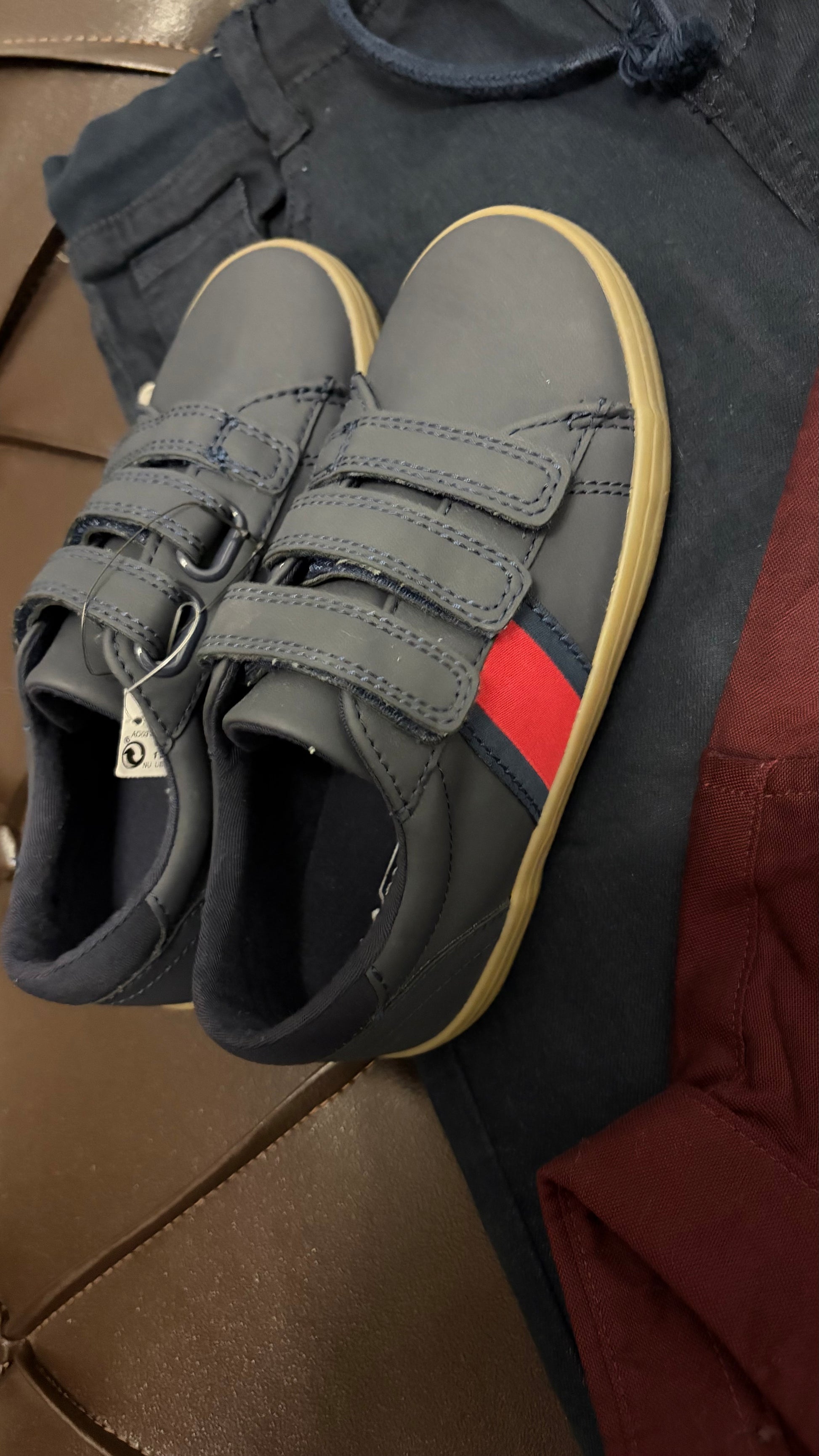 Next Navy Trousers + Wine Shirt + Grey/Red Sneakers