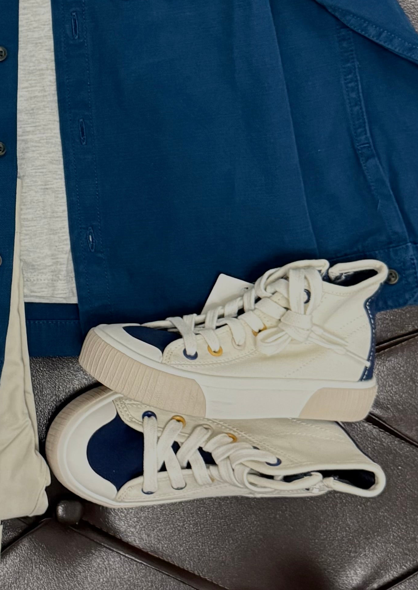 A stylish boys’ casual outfit featuring a soft grey tee layered under a navy button-down shirt jacket. Paired with cream trousers for a clean, modern contrast, and finished with navy-and-cream high-top sneakers for a cool, sporty touch. Perfect for outings, weekend activities.