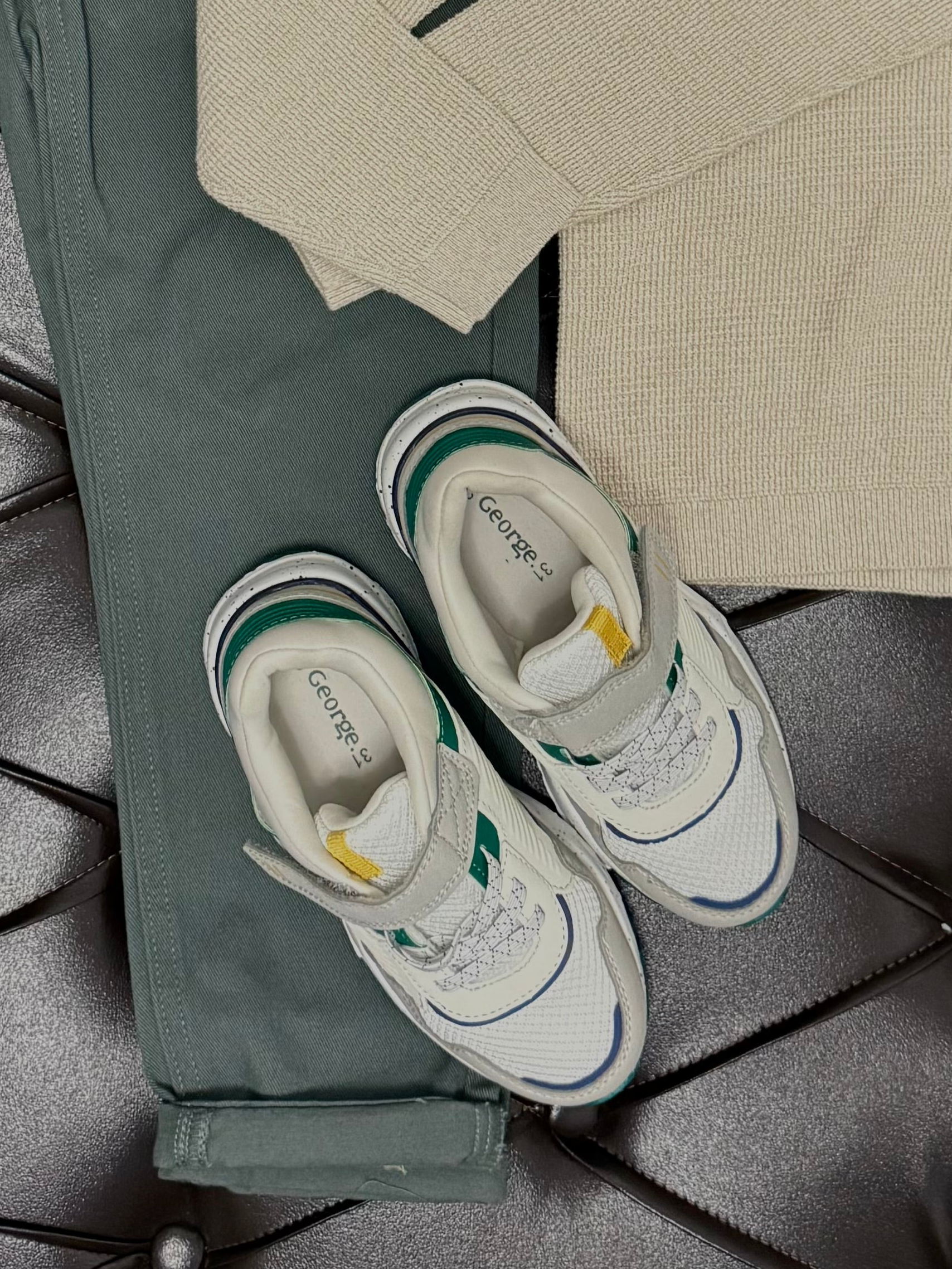 A cosy knit sweater in soft sage paired with deep-green joggers for a comfortable but stylish fit. The white sneakers add a fresh contrast, ideal for outings, travel, or cooler weather days.